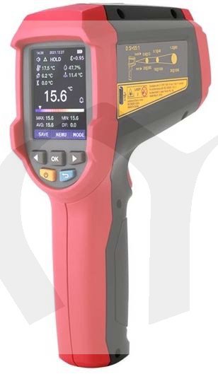 Profesionální bezkontaktní infračervený teploměr UT-305A+ dokáže rychle a přesně určit povrchovou teplotu v rozmezí -50°C až +1850°C změřením infračervené energie vyzařované z cílového povrchu. Pro snazší a intuitivní zaměření přístroje na cílový povrch je zabudován laser, který indikuje správné zamíření teploměru. Poměr vzdálenosti k průměru měřeného povrchu je u tohoto přístroje 55 :1. Tento teploměr má zabudované další funkce, např. měření teploty okolí teploměru, měření teploty kontaktním termočlánkem typu K, měření relativní vlhkosti okolí teploměru. Na základě těchto změřených hodnot sám vypočte teplotu rosného bodu nebo teplotu vlhkého teploměru. Do teploměru je možné zadat systémový čas a datum. Měření hodnot je možné naplánovat v předem stanovených intervalech a celkem 999 událostí (skupin dat) uložit do interní paměti. Je možné přednastavit emisivitu měřeného povrchu v rozmezí 0,1 až 1,0. Indikaci přednastavených funkcí a naměřených hodnot zajišťuje jasný a vysoce kontrastní TFT LCD barevný displej a hraniční hodnoty jsou indikovány bzučákem a na displeji. Je možná indikace minimálních, maximálních a průměrných teplot a odchylek od průměru ( MIN, MAX, AVG, DIF ). Přístroj je odolný proti pádu z výšky 1 metru.