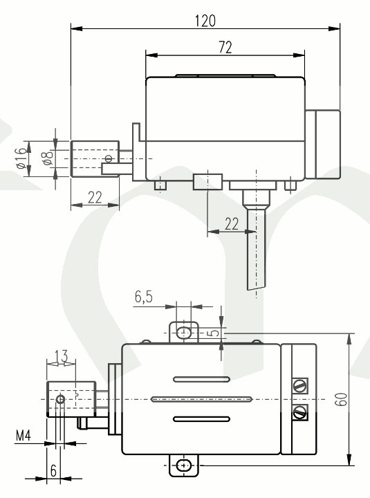 Vlastní termostat tvoří stonek a spínací hlavice. Stonek se skládá z dilatační trubky a invarové tyče. Spínací element je připevněn na výkyvném pravo­úhlém mostu, který je unášen dvěma spirálovými pru­žinami a jeho poloha proti invarové tyči se mění regu­lačním šroubem, jenž působí na jedno rameno výkyv­ného mostu. Vlastní spínací element tvoří dvě pruži­ny, kloubově spojené. Pro upevnění termostatu má základní deska dva nálitky s otvory. Při montáži je nutné, aby spodní díl spínací hlavice byl vzdálen od stěny tělesa asi 2 cm a tento prostor byl vyplněn izolační látkou tak, aby teplota spínací hlavice nepře­stoupila +120 °C.