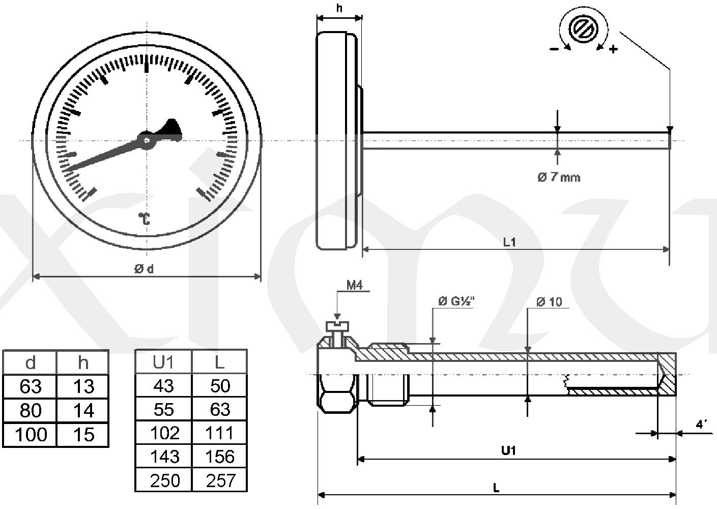 Teploměr se skládá z hlavice vyrobené z uhlíkové pochromované oceli, skleněného průzoru a mosazného stonku pr.7mm.