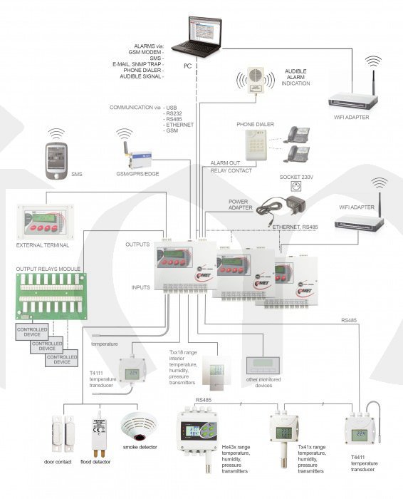 •na základě vzniklých alarmů vykonávat další akce (akustická, optická signalizace, ovládání reléových výstupů, vysílání SMS zpráv, ovládání telefonního hlásiče, předávání zpráv pomocí různých protokolů Ethernetového rozhraní atd.)