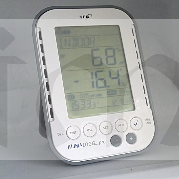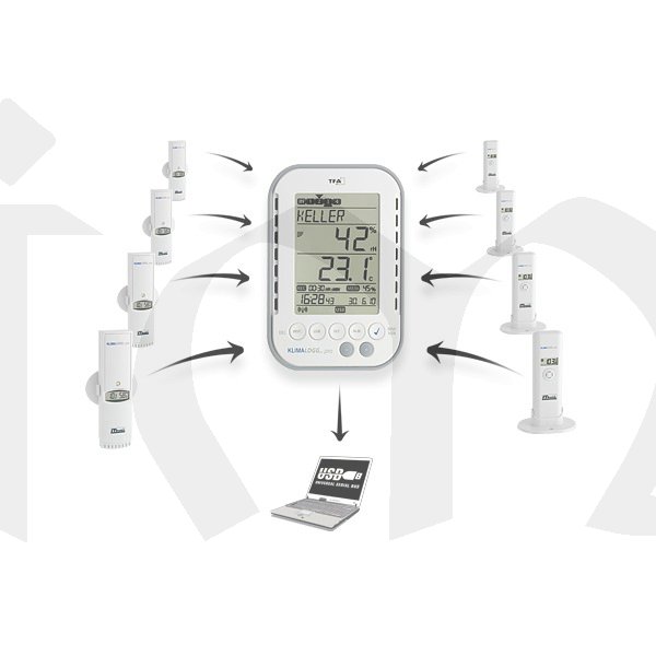 Teploměr s vlhkoměrem "TFA 30.3039" připojitelný do PC přes USB bezdrátový přijímač (velikost USB flash paměti, viz. obrázek níže) zaznamenává vnitřní teplotu a vlhkost, zobrazuje rosný bod, max. a min. naměřené hodnoty s časem a datem měření, průměrné hodnoty. Unikátní funkcí jsou pak alarmy pro dolní a horní mez měřených veličin (teplota, vlhkost). Přístroj má zabudovanou paměť až pro 50 000 naměřených hodnot, které si můžete nechat zobrazit přes displej (mnohem lépe se však data budou zpracovávat v PC).