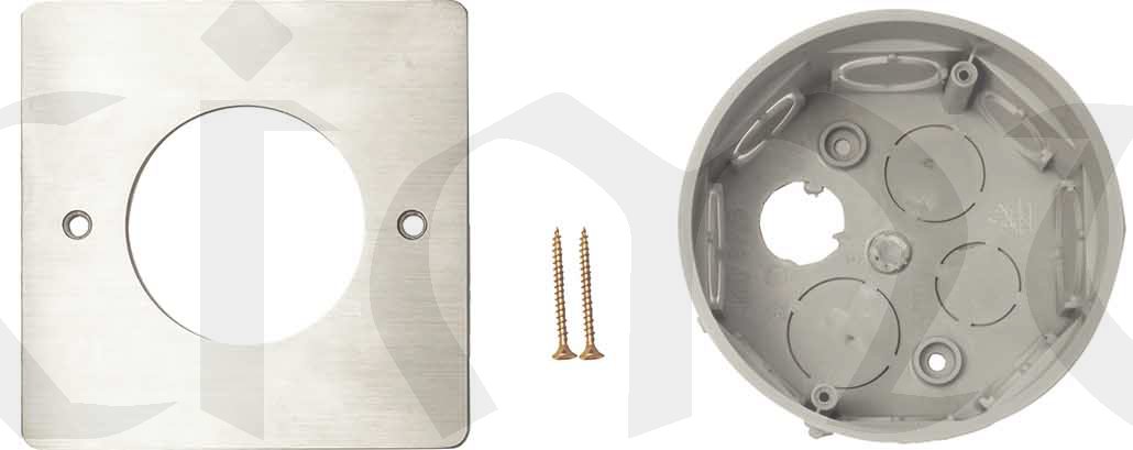 Kovová čtercová deska, plastová krabice a dvojice vrutů 3,5x35 se zápustnou hlavou (pozink).