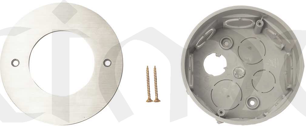 Kovová kruhová deska, plastová krabice a dvojice vrutů 3,5x35 se zápustnou hlavou (pozink).