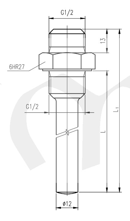 Ochranná jímka pro termostat, materiál ocel, povrchová úprava Chrom, závit pro procesní připojení G1/2" vnější