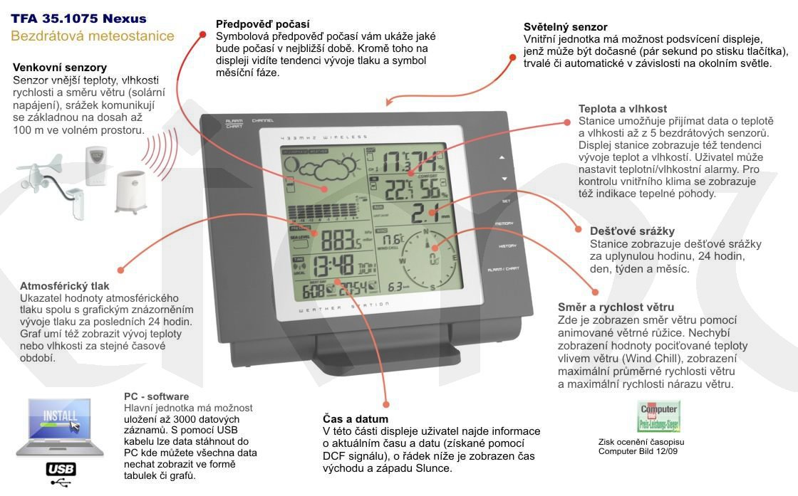 Poloprofesionální meteorologická stanice pod označením TFA 35.1075 NEXUS s možností připojení k PC přes USB port je svými funkcemi a vzhledem velice podobná stanici WXR LM2. Tento přístroj, posouvá možnosti domácí meteorologie opět o kus dále. Kompletní balení obsahuje vnitřní hlavní jednotku v luxusním černém provedení s modrým podsvícením, síťový adaptér, kvalitní software, USB kabel, čidlo pro měření vnější teploty a vlhkosti, srážkoměr a miskový anemometr.