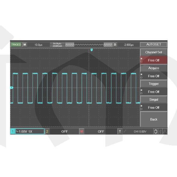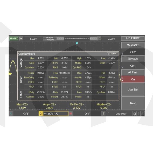 - automatické měření parametrů signálu: Max, Min, High, Low, Middle, Pk-Pk, Ample, Mean, Cycle Mean, RMS, Cycle RMS, Area, Cycle Area, OverShoot, PreShoot, Period, Freq, Rise, Fall, +Width, -Width, +Duty, -Duty, RiseDelay, FallDelay, Phase, FRFR, FRFF, FFFR, FFFF, FRLF, FRLR, FFLR, FFLF