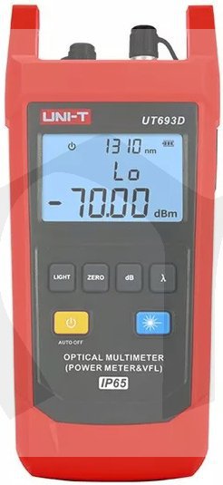 Optický multimetr UT-693D je vhodný pro konstrukci a údržbu optických kabelových tras, pro výrobu, instalaci, provoz a údržbu optických přenosových systémů, pro hodnocení optického zařízení v optickém inženýrství, laboratořích a výrobních závodech. Ruční tester optické energie UT693D slouží k měření absolutní optické energie nebo relativní ztráty optické energie v délce vodiče z optických vláken. Je navržen tak, aby vydržel pád ze 2m, je vhodný pro práci ve venkovním prostředí. Odolnost vůči prachu/vodě je IP65. Navíc disponuje podsvíceným displejem, automatickým vypnutím po 10 minutách nečinnosti. Oproti podobným testerům UT692D a UT692G může detekovat poškození optického vlákna do vzdálenosti 8 až 10 km.